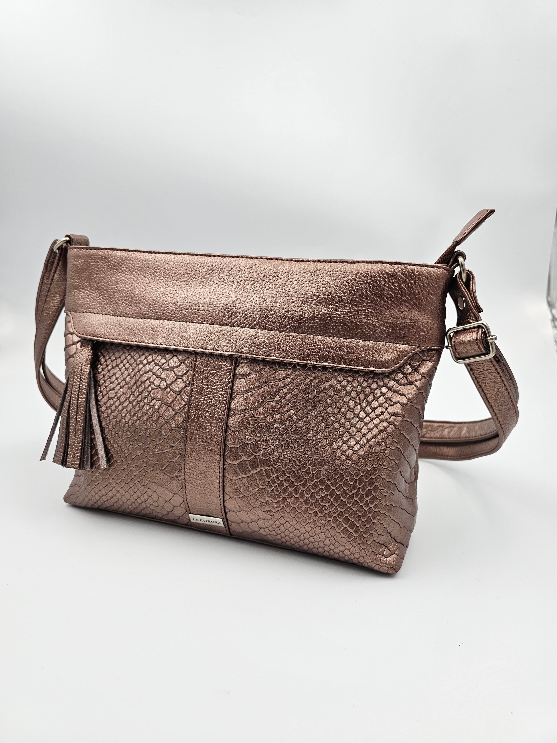 Su textura y tono metálico elevan cualquier outfit. Ideal para mujeres que buscan marcar presencia sin perder sofisticación. Una joya en tu colección.